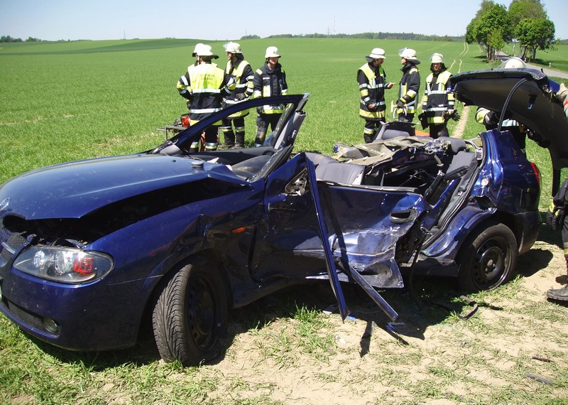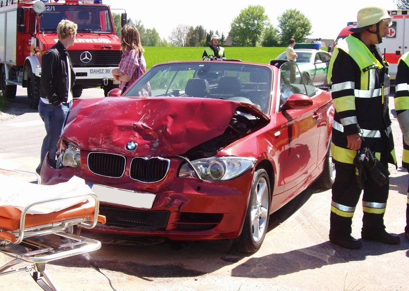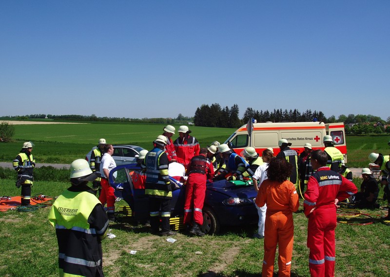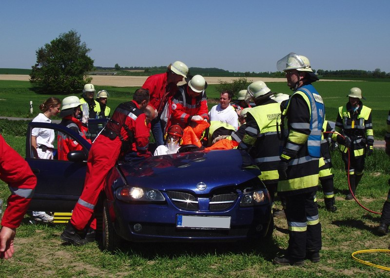 Einsatz am Pfingstsamstag für die Feuerwehren Ampermoching, Dachau und Hebertshausen!In den frühen Nachmittagsstunden des Samstags kam es im Kreuzungsbereich im Hebertshausener Ortsteil Prittlbach zum Zusammenstoß zweier Pkw´s, wobei ein Fahrzeug in einen angrenzenden Acker geschleudert wurde.