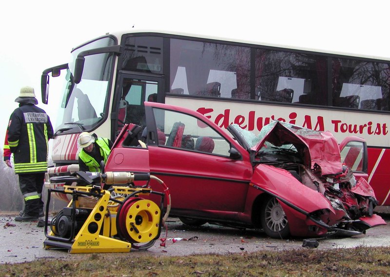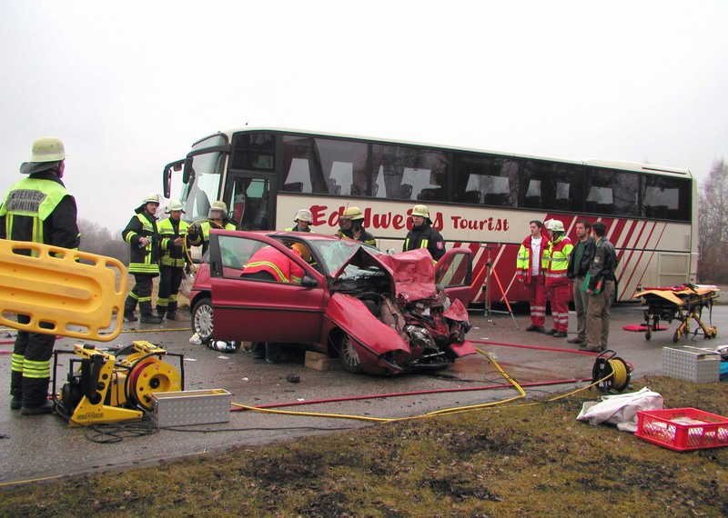 Aus noch ungeklärter Ursache stieß die Lenkerin eines Kleinwagens in einer Rechtskurve mit einem entgegenkommenden Schulbus zusammen. Durch den Aufprall wurde die Frau in Ihrem Fahrzeug eingeklemmt und musste von der Feuerwehr Günding befreit werden.