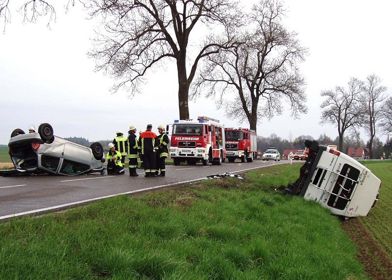 Zu einem schweren Verkehrsunfall wurden am Sonntag früh die Feuerwehren Eisenhofen, Rumeltshausen und Schwabhausen auf die Staatsstraße zwischen Schwabhausen und Oberroth alarmiert.Aus noch ungeklärter Ursache kam es dort zu einem Zusammenstoß zweier Fahrzeuge, wobei ein Wagen an der Böschung seitlich zum Liegen kam und einer auf dem Dach auf der Fahrbahn.