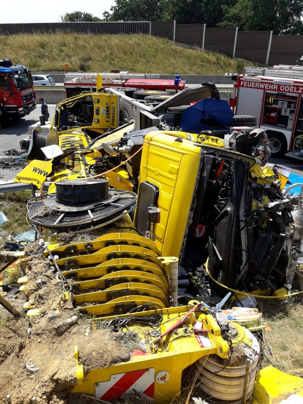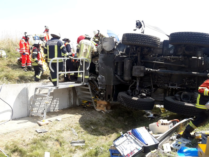 Der Fahrer wurde dabei mittelschwer verletzt und in seiner Kabine eingeklemmt und musste von Feuerwehr und THW mit hydraulischem Rettungsgerät befreit werden.