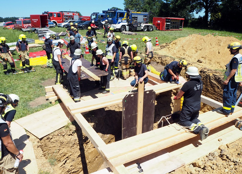 Zum Abschluss der Ausbildung hatten alle Teilnehmer gemeinsam eine anspruchsvolle Einsatzübung mit zeitversetztem Eintreffen zu absolvieren. Es galt dabei eine verschüttete Person aus einem 4 Meter tiefen Schacht zu retten, bei dem es bereits zu Kantenabbrüchen am Grubenrand gekommen ist.