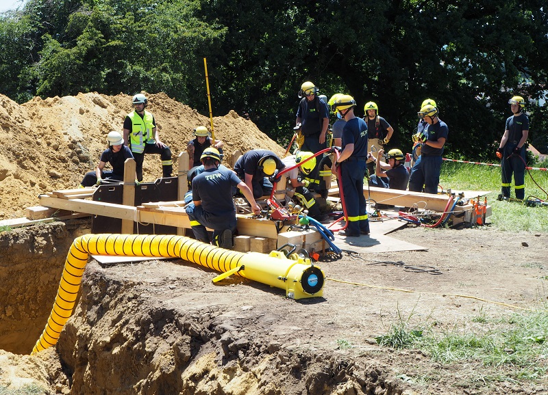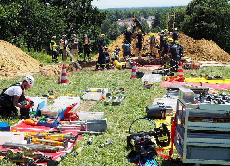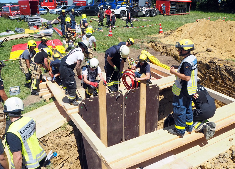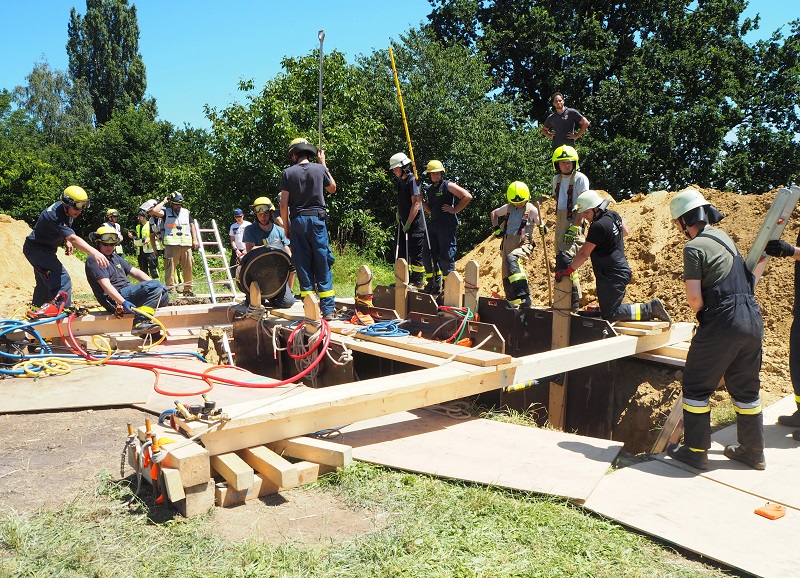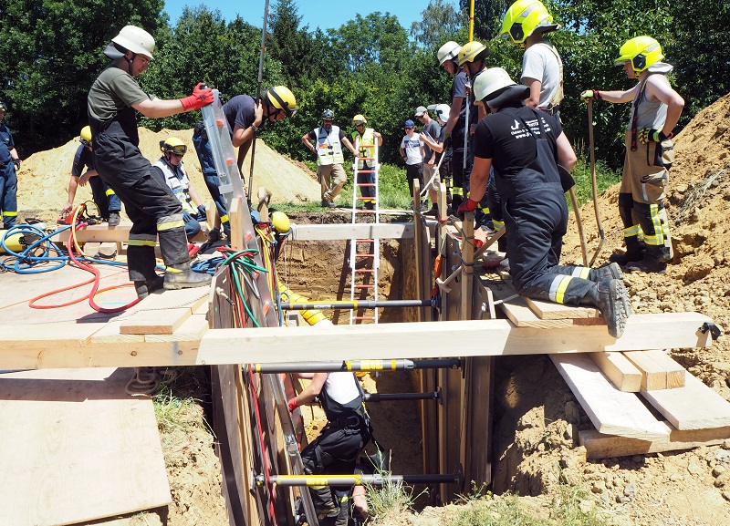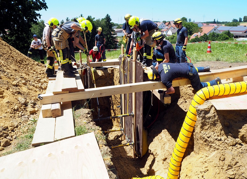 Die Ausbilder Irakli West (Heavy Rescue Germany), Josef Grain (Kreisbrandinsepktion) und Andreas Schultes (THW) haben sich wieder einiges einfallen lassen, um die Teilnehmer nicht nur wegen der Temperaturen ins Schwitzen zu bringen. Für die neuen Kräfte aus Eisenhofen und Weichs stand zunächst Grundlagenschulung im Bereich Tiefbauunfälle auf dem Programm, während die bereits erfahrene Mannschaft aus der Feuerwehr Günding sowie dem THW parallel Übungsszenarien mit komplexeren Anforderungen bewältigen musste.