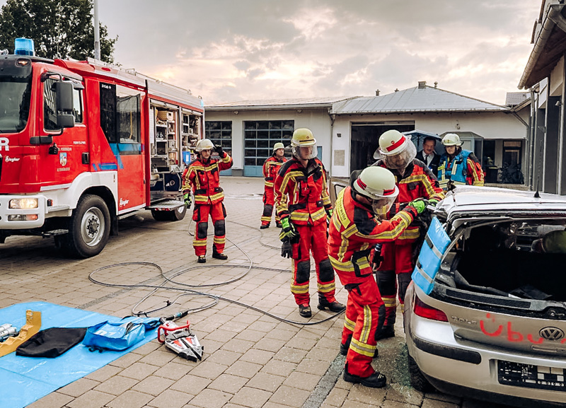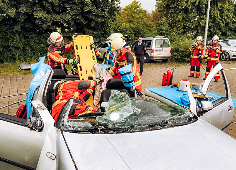 Mit hydraulischem Rettungsgerät arbeiteten sich die Einsatzkräfte routiniert am Fahrzeug vor, um die eingeklemmte Person möglichst schonend zu befreien. Bereits nach etwa 15 Minuten konnte die Übungsperson erfolgreich gerettet und dem Rettungsdienst übergeben werden.
