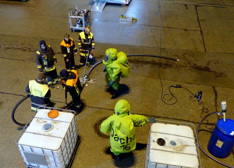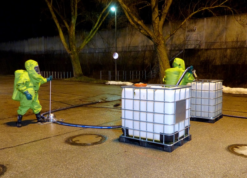Da der Landkreis Dachau jedoch darüber hinaus umfangreiche Gerätschaften für Gefahrguteinsätze bereithält, wurde der Lehrgang um 2 Tage erweitert. Nach eingehender Gerätekunde am „Abrollbehälter Umwelt“ wurde das Abdichten, Auffangen und Umfüllen von auslaufenden Gefahrstoffen bei einer Leckage trainiert.