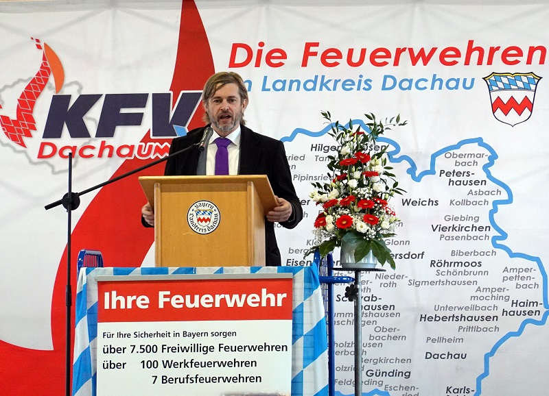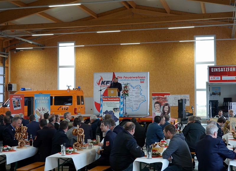 Bürgermeister Richard Reischl hob in seinem Grußwort die gute Zusammenarbeit zwischen der Gemeinde Hebertshausen und dem Landkreis Dachau bei der Baumaßnahme hervor und hieß die Kreisbrandinspektion Dachau in seiner Gemeinde herzlich willkommen. Als Symbol dafür wurde ein extra hergestelltes 14 kg schweres Brot mit den Wappen der Gemeinde und des Landkreises überbracht. Das eigentlich noch übliche Salz wurde durch 10 Träger Bier ersetzt. Richard Reischl dankte dem Landkreis auch für den Mut, ein Katastrophenschutzzentrum in der vorliegenden Ausprägung zu bauen. Derartige Projekte sind in Bayern noch nicht üblich, aber der Bedarf wird mittlerweile zunehmend festgestellt.
