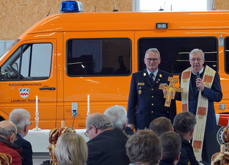 Anschließend spendete Pfarrer Monsignore Michael Bartmann den kirchlichen Segen und vertrat die entschuldigte evangelische Pfarrerin Ulrike Markert im ökumenischen Sinn. In seiner Predigt unterstrich Pfarrer Bartmann die Gemeinsamkeiten zwischen der kirchlichen Seelsorge und der Arbeit aller Hilfsorganisationen. Danach wurde der kirchliche Segen an das Gebäude, das Fahrzeug und insbesondere an all diejenigen Menschen, gespendet, welche mit ihrem Wirken beides erst zum Einsatz bringen. Als Geschenk überreichte er ein Kreuz, welches im Herrgottswinkel des Aufenthaltsraums einen würdigen Platz finden wird.