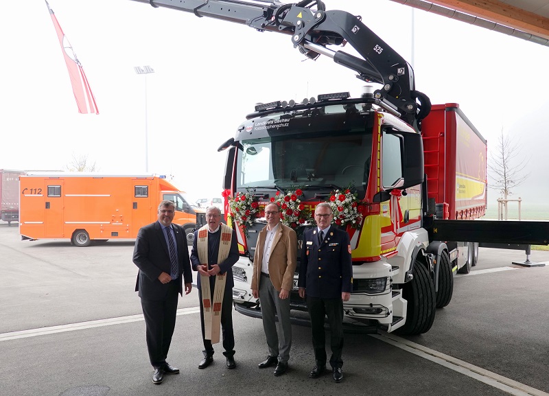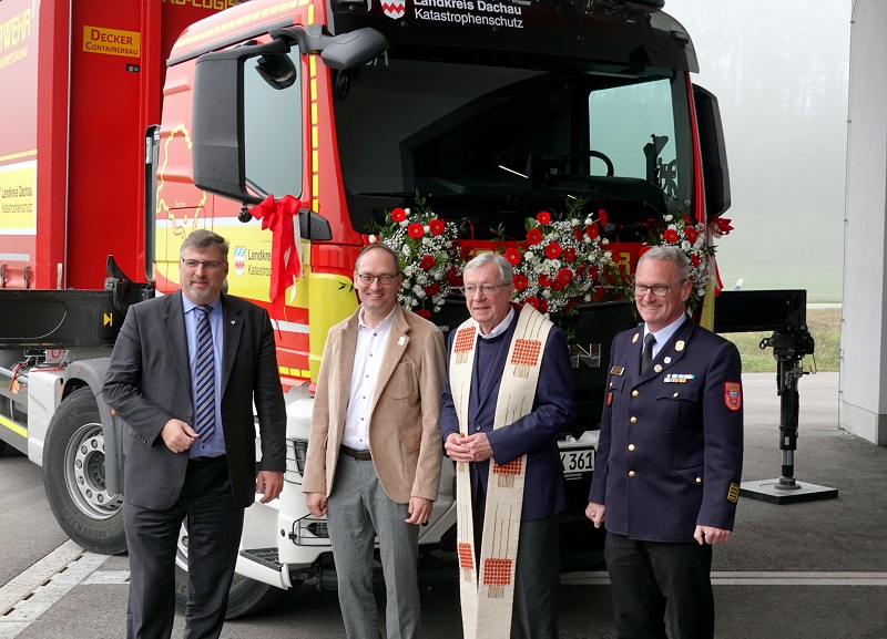 Vor der Spende des kirchlichen Segens ging Kreisbrandrat Georg Reischl noch auf das Wechselladerfahrzeug mit Kran des Landkreises ein, welches im Katastrophenschutzzentrum stationiert ist und überwiegend durch die Einsatzkräfte der Feuerwehr Hebertshausen zum Einsatz gebracht wird. Das Fahrzeugkonzept wurde maßgeblich durch den früheren Kreisbrandrat Franz Bründler geprägt, der krankheitsbedingt nicht an der Veranstaltung teilnehmen konnte. Ohne den Einsatz von Franz Bründler würde das Fahrzeug in der vorliegenden Konzeption vermutlich nicht hier stehen, so Reischl. Nachdem im Katastrophenschutzzentrum auch mehrere Abrollbehälter untergebracht sind, war der Bedarf an ein geeignetes Trägerfahrzeug die logische Konsequenz. Die Wahl fiel auf ein 4-achsiges Fahrgestell mit Aufzieheinrichtung für Container und einen Ladekran. Über die Ausschreibung kam es zu einem Fahrgestell vom Typ MAN TGS 35.510 8x4. Die Container-Aufziehvorrichtung sowie der Kran stammen von der Firma HIAB. Dieser hat eine maximale Ausladung von knapp 22 m mit einer Hubkraft von 1,2 t an der Spitze. Bei 3 m Ausladung beträgt die Hubkraft 14,7 t. Seit der Inbetriebnahme Ende 2021 leistete das Fahrzeug bereits wertvolle Hilfe beim Auf- und Abbau von Impf- und Teststationen sowie Flüchtlingsunterkünften.