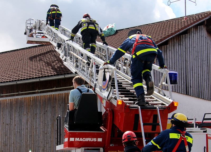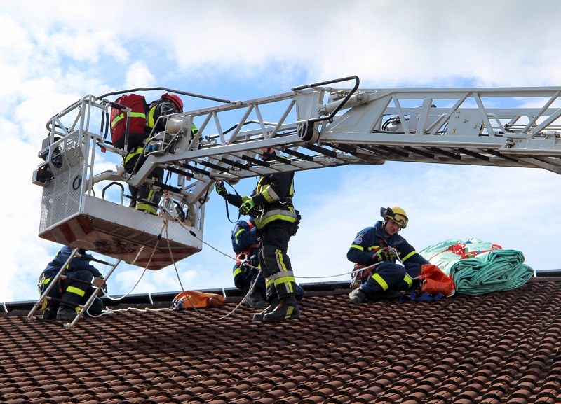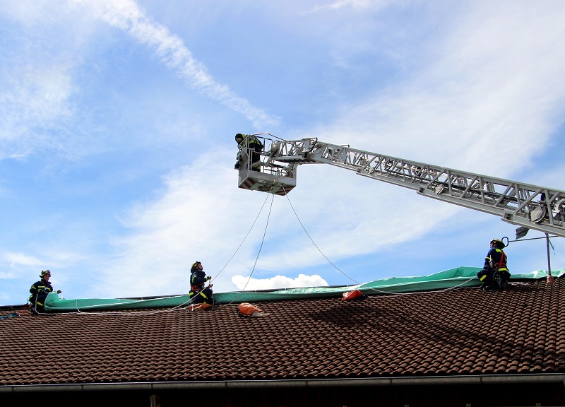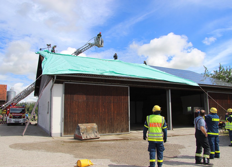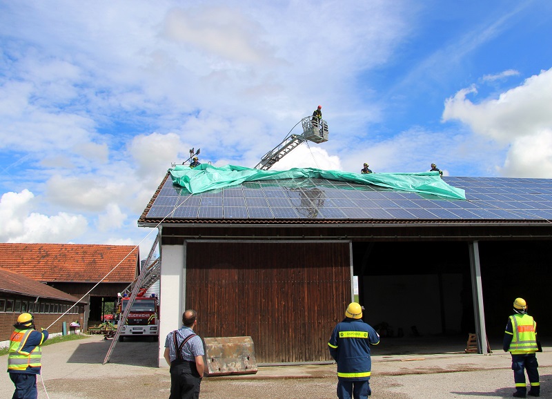 Deshalb forderten sie die Feuerwehr Dachau mit der Drehleiter sowie das THW nach, um ein Notdach über der Photovoltaikanlage zu befestigen.