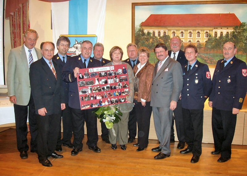 Beim Ehrenabend der Kreisbrandinspektion Dachau im Saal der Landgaststätte Lachner in Stetten erhielt neben 13 weiteren verdienten Feuerwehrmänner aus dem Landkreis auch Kreisbrandrat Rudi Reimoser die staatliche Ehrung für 40-jährige aktive Dienstzeit – die Ehrung nahm Landrat Hansjörg Christmann vor. In seiner Laudatio würdigte Kreisbrandinspektor Heinrich Schmalenberg die Verdienste Reimosers und zeigte dessen Werdegang im Feuerwehrwesen auf. Reimoser trat am 01. Juli 1965 als aktives Mitglied der Dachauer Feuerwehr ein; nachdem erfolgreichen Besuch verschiedener Lehrgänge an den Staatlichen Feuerwehrschulen wurde er vom damaligen Kommandanten Fritz Müllrt mit der verantwortungsvollen Aufgabe eines Gruppen- und später eines Zugführers beauftragt. Aufgrund seines Fachwissens wurde er am 01. Januar 1978 von Kreisbrandrat Kurt Zehrer zum Kreisbrandmeister für den Landkreis Dachau zunächst für die Feuerwehren der Gemeinden Bergkirchen und Schwabhausen bestellt; später kamen noch die Wehren der Gemeinde Sulzemoos dazu.Nach dem wegen Erreichung der Altersgrenze ausgeschiedenen Kreisbrandinspektors Karl Brandmair übernahm er am 01. Juni 1997 diese Funktion und war für die Feuerwehren des westlichen Landkreises zuständig. Zusätzlich fielen die Abnahme der Leistungsprüfungen, sowie die Maschinistenausbildung in seinen Zuständigkeitsbereich. Im Laufe der Jahre erhielt Kreisbrandrat Reimoser mehrere Auszeichnungen, so u.a. das Feuerwehr-Ehrenkreuz in Silber des Deutschen Feuerwehrverbandes, das Bayerische Feuerwehr-Ehrenkreuz in Silber des Landesfeuerwehrverbandes Bayern und das staatliche Feuerwehr-Steckkreuz, die höchste Auszeichnung im bayerischen Feuerwehrwesen. Seit Wiedergründung des Landes-, Bezirks- und Kreisfeuerwehrverbandes in Bayern in den Jahren 1994/95 übernahm er im Kreisfeuerwehrverband Dachau die Funktion des Schriftführers – auf Bezirksebene ist Reimoser Leiter des Fachbereiches „Öffentlichkeitsarbeit“ für Oberbayern und vertritt diesen im Landesfeuerwehrverband Bayern. Nach dem Ausscheiden von Kreisbrandrat Erwin Zehrer im Jahre 2004 wurde Reimoser von den Kommandanten des Landkreises mit überwältigender Mehrheit zum Kreisbrandrat des Landkreises Dachau gewählt und ist zugleich Vorsitzender des Kreisfeuerwehrverbandes Dachau. Kreisbrandinspektor Schmalenberg überreichte dem Jubilar im Namen der Angehörigen der Kreisbrandinspektion und des Kreisfeuerwehrverbandes Dachau eine Bildtafel, wo die einzelnen Stationen von Reimosers Feuerwehrlebens festgehalten wurden.