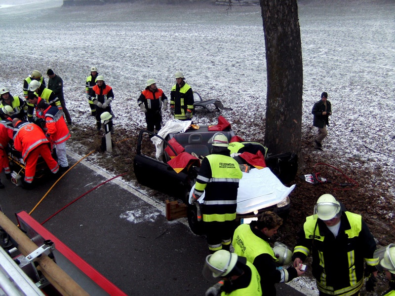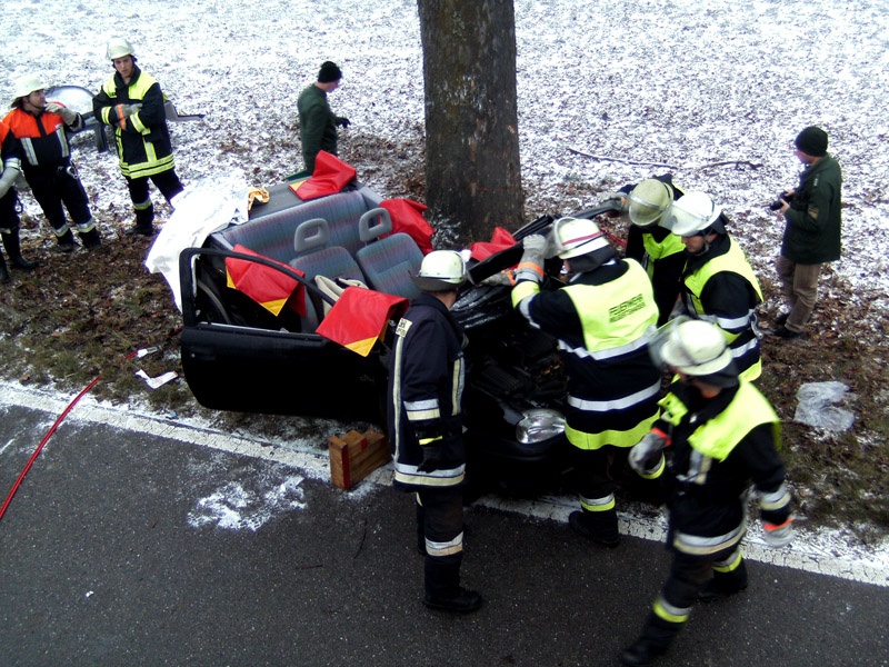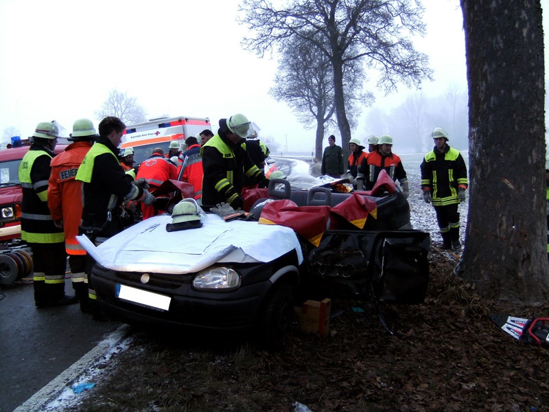 Bereits in den ersten Stunden des neuen Jahres wurde die Feuerwehr Hilgertshausen von der ILS Ingolstadt zu einem schweren Verkehrsunfall mit eingeklemmter Person auf der Staatsstrasse 2050 zwischen Stadelham und Junkenhofen in den Landkreis Pfaffenhofen alarmiert.Durch den Aufprall des PKW an einen Baum wurde der Pkw-Lenkerin in ihrem Fahrzeug eingeklemmt und mußte von Einsatzkräften der Feuerwehr Hilgertshausen mit schwerem technischen Gerät befreit werden. Der Fahrerin erlitt bei dem Aufprall schwere Verletzungen und wurde von Notarzt und Rettungsdienst medizinisch versorgt. Der angeforderte Rettungshubschrauber konnte wegen Nebels nicht starten, deshalb wurde die Patientin mit einem Rettungswagen in ein Krankenhaus verlegt.