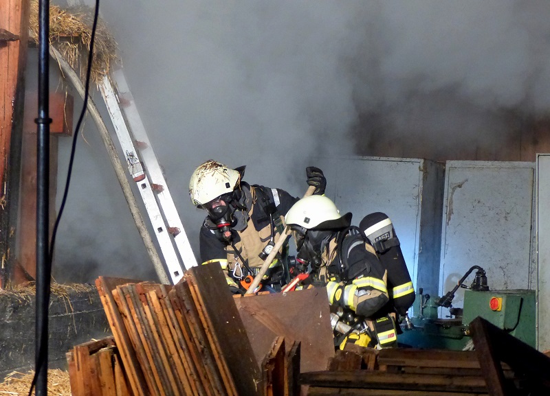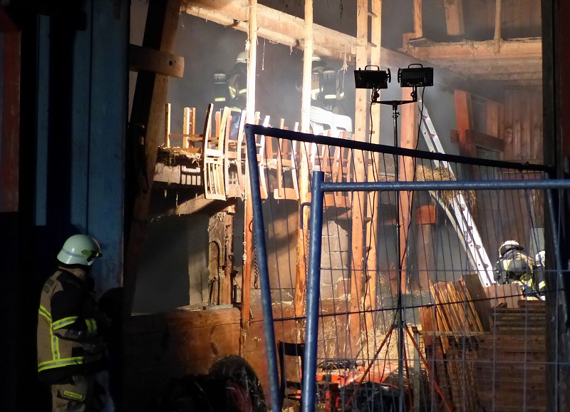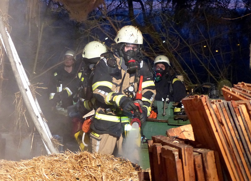 Im Inneren konnte der erste Angriffstrupp größere Mengen an brennendem Stroh und diverse Holzteile ausfindig machen. Zur weiteren Unterstützung wurde die Alarmstufe entsprechend erhöht und die Helfer der Feuerwehr Dachau mit an die Einsatzstelle beordert.