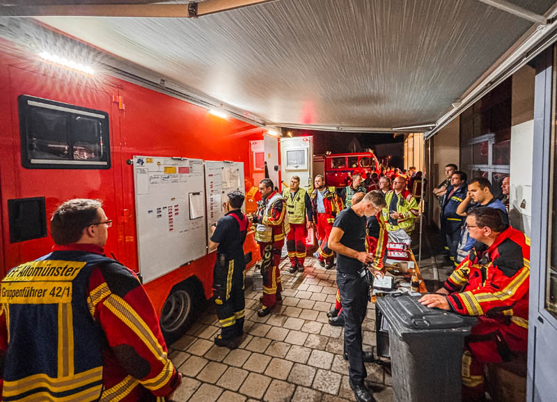 Zur Koordinierung der Einsätze wurde gegen 20.00 Uhr die Kreiseinsatzzentrale im Katastrophenschutzzentrum in Betrieb genommen, von hier aus wurden bis 4.00 Uhr morgens rund 180 Einsätze betreut, dabei handelte es sich meist um überschwemmte Gehwege und Fahrbahnen sowie vollgelaufene Keller und Gebäude.