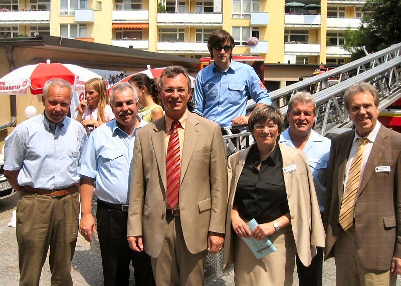 Bereits zum zehnten Mal vertrat der Kreisfeuerwehrverband Dachau im Auftrag des Bezirksfeuerwehrverbandes Oberbayern beim Tag der offenen Tür der Regierung von Oberbayern in München die Feuerwehren des Regierungsbezirkes. Während die Feuerwehr Karlsfeld bei der Veranstaltung in der Maximilianstrasse ihre Drehleiter präsentierte, stellte der Kreisfeuerwehrverband Dachau Informationsstände zum Thema Jugendarbeit in den Feuerwehren und die Hebertshauser und Indersdorfer Feuerwehr jeweils ein Hilfeleistungs- und ein Löschgruppenfahrzeug den Besuchern vor. Informationsschwerpunkt in diesem Jahr waren die Themen „Lernort Regierung“ und die Jugend; so wurde den jugendlichen Besuchern die Jugendarbeit in den Feuerwehren in vielfältiger Weise vorgestellt. Kreisbrandrat Rudi Reimoser, Kreisbrandinspektor Heinrich Schmalenberg und Kreisjugendwart Stephan Hueber standen dabei den Besuchern Rede und Antwort. Bei einem angenommenen Garagenbrand, bei dem die Feuerwehren Hebertshausen und Indersdorf ihre Fähigkeiten unter Beweis stellten, fungierte der Regierungspräsident als „Verletzter“ und wurde von „seinen“ Feuerwehren gerettet und dem Rettungsdienst übergeben. Hohen Besuch erhielt die Dachauer Delegation durch Bayerns Kultusminister Siegfried Schneider, der sich ausführlich über das Feuerwehrwesen in Bayern informieren ließ – natürlich durfte auch eine Fahrt mit der Drehleiter über die Dächer Münchens nicht fehlen.