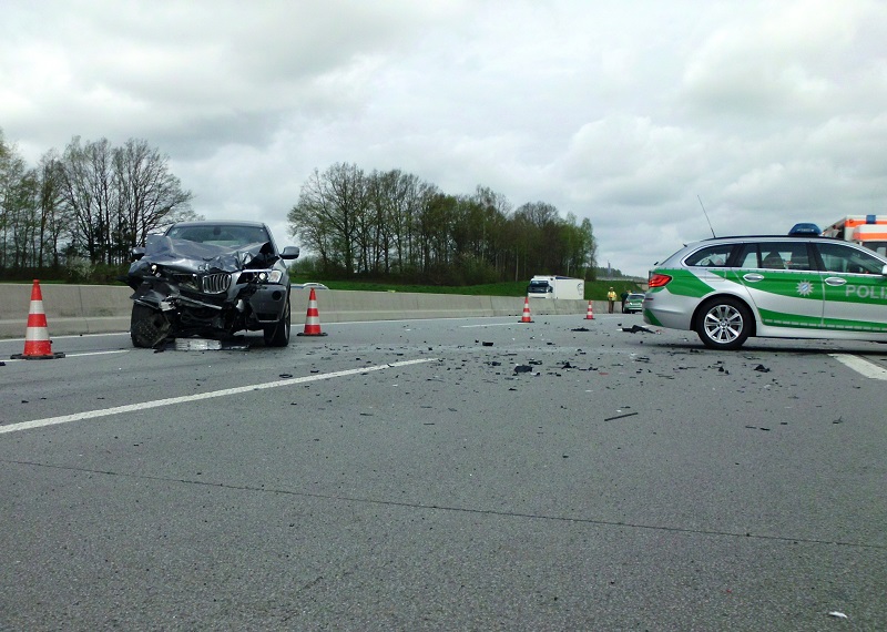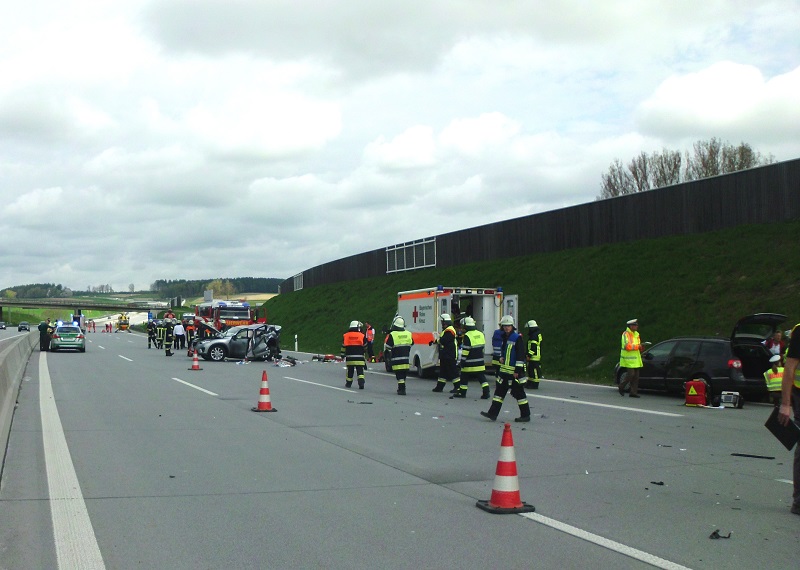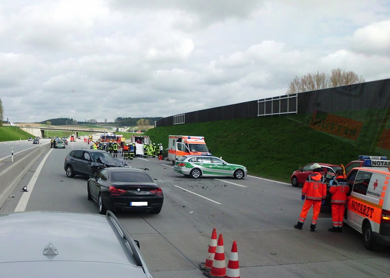 Aus noch unbekannter Ursache hat der Fahrer eines Mazda Vans mit ungarischem Kennzeichen beim Spurwechsel einen BMW X 3 übersehen. Durch die Wucht des Aufpralles wurde das Heck des Mazda bis zur B-Säule eingedrückt; der Fahrer erlitt dabei so schwere Verletzungen, dass er trotz aller Bemühungen von Notarzt und Rettungsdienst noch an der Unfallstelle verstarb. Der Beifahrer erlitt mittelschwere Verletzungen und wurde mit dem Rettungshubschrauber zur weiteren Behandlung ins Klinikum Harlaching verbracht .