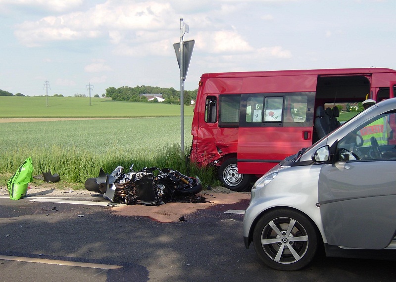 Auch ein Bremsmanöver des Zweiradfahrers konnte eine Kollision der beiden Fahrzeuge nicht verhindern - das Kraftrad prallte in das Heck des Kleinbusses. Durch die Wucht des Aufpralls wurde der Ford an den Straßenrand geschleudert.