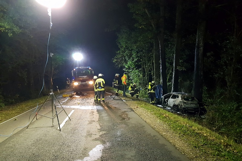 Gegen 1.30 Uhr wurden die Rettungskräfte alarmiert; zu diesem Zeitpunkt stand das Fahrzeug bereits in Vollbrand, zunächst war unklar ob sich noch Personen darin befinden. Nachdem der Brand unter Atemschutz abgelöscht war herrschte traurige Gewissheit, für den PKW-Lenker kam jede Hilfe zu spät, er verstarb in dem Wrack.