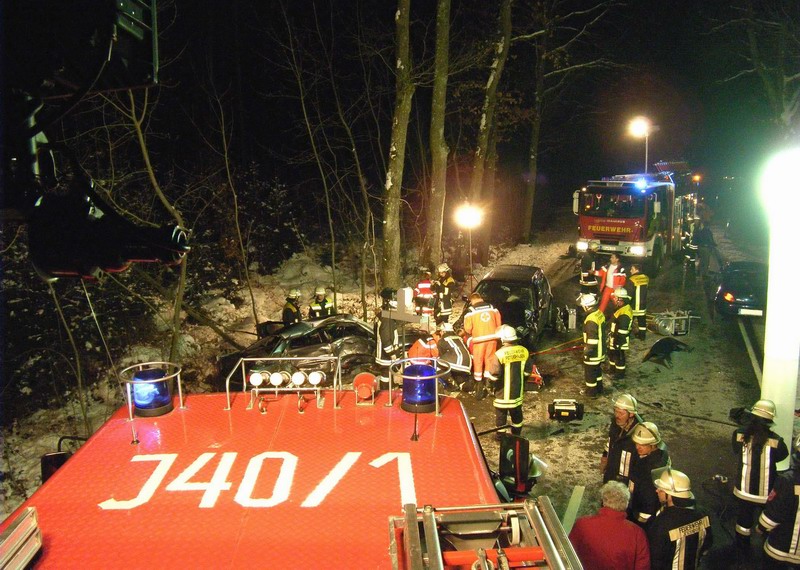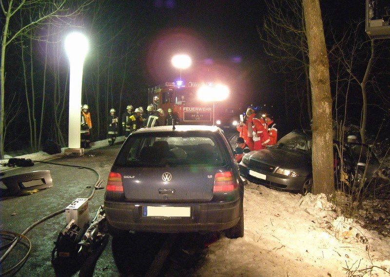 Eine Person wurde dabei in ihrem Fahrzeug eingeklemmt und musste von Einsatzkräften der Feuerwehr mit schwerem technischem Gerät befreit werden – die zweite Person wurde nach der medizinischen Erstversorgung durch Notarzt und Rettungsdienst mit dem Rettungshubschrauber in ein Krankenhaus geflogen.