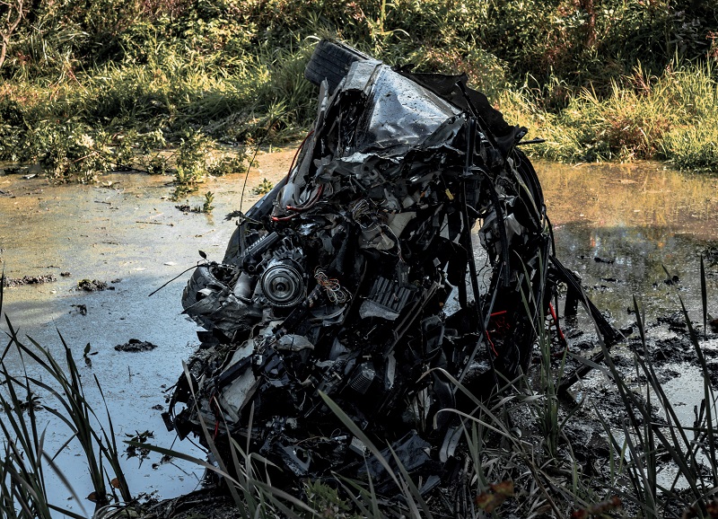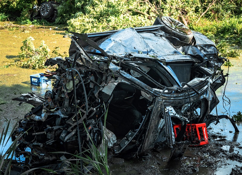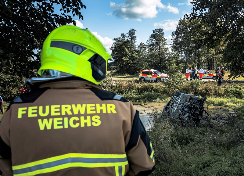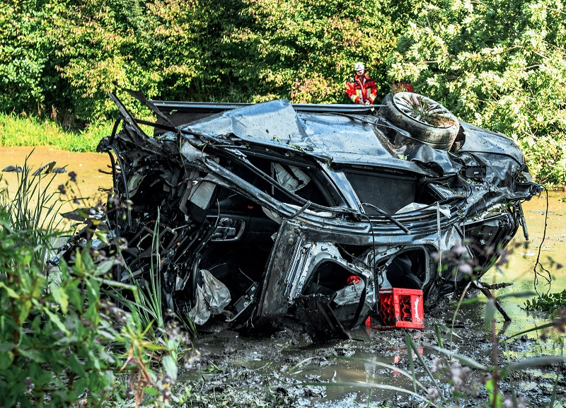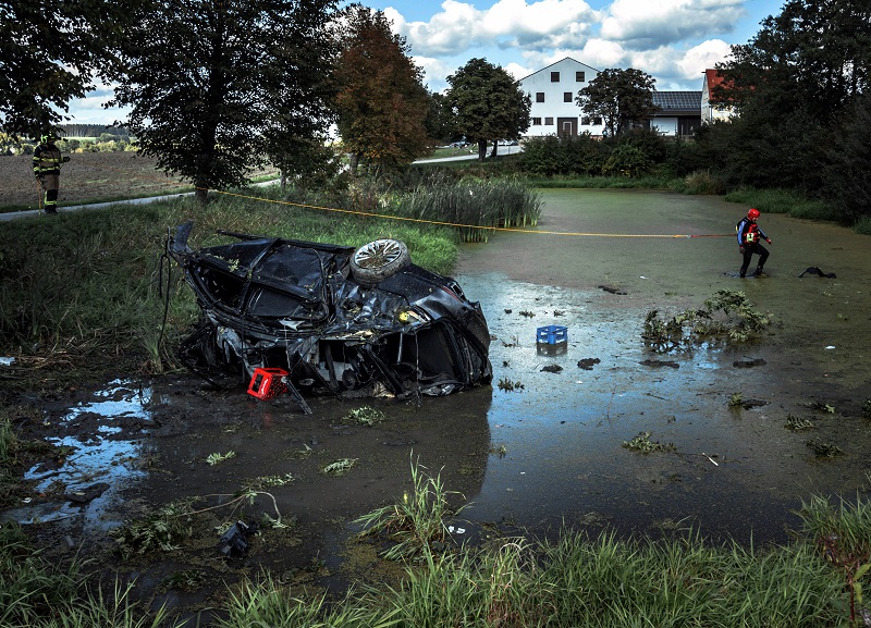 Aus noch ungeklärter Ursache ist ein BMW-Lenker auf der Verbindungsstraße von Pasenbach nach Weichs von der Fahrbahn abgekommen und an einen Ranken geraten, der schließlich als Rampe für das Fahrzeug gewirkt hat; infolge wurde der BMW an einen Baum geschleudert, welcher ebenso wie der PKW zweigeteilt wurde – das Wrack kam schließlich im danebenliegenden Weiher seitlich zum Liegen.