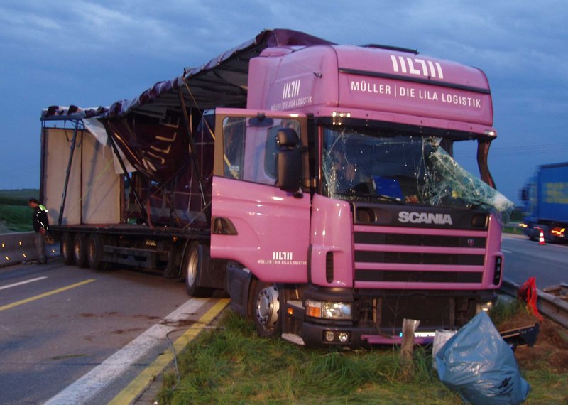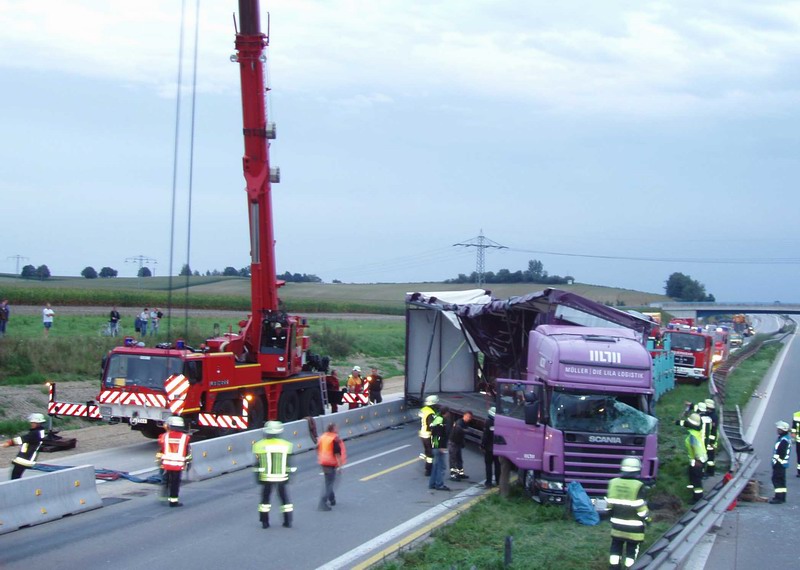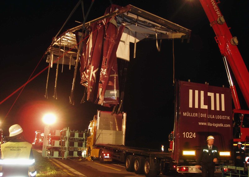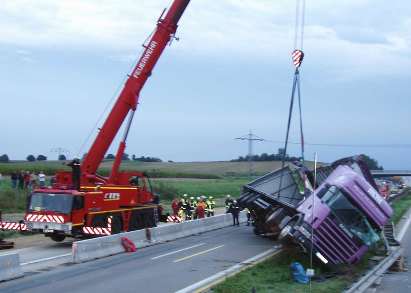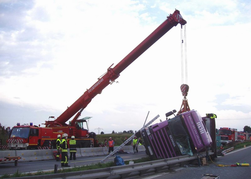 Im Baustellenbereich der A 8 zwischen den Ausfahrten Dachau und Sulzemoos kam es am Dienstagnachmittag (21.08.07) zu einem Lkw-Unfall.Aus noch ungeklärter Ursache touchierte ein Brummilenker, der Spezialpaletten geladen hatte, die Baustellenabsicherung, durchbrach die Mitteilleitplanke und kam seitlich zum Liegen – dabei erlitt der Fahrer Verletzungen und wurde von Notarzt und Rettungsdienst in ein Krankenhaus eingeliefert.