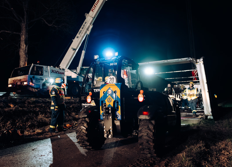 Mit Unterstützung eines Teleskopladers gelang es den Einsatzkräften nach etwa drei Stunden die Entladung durchzuführen. Erst danach konnte der angeforderte Autokran in Aktion treten und das umgestürzte Gespann aufrichten.
