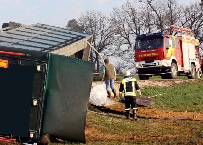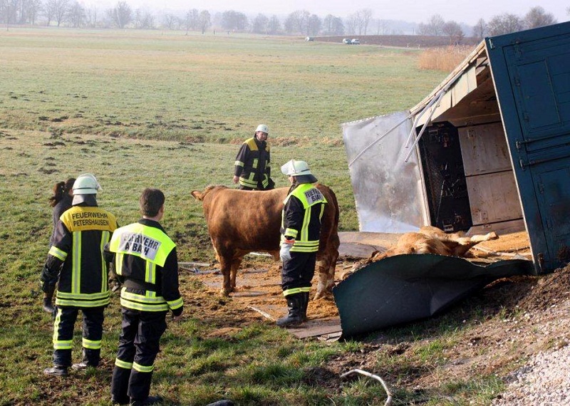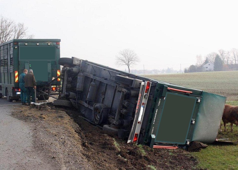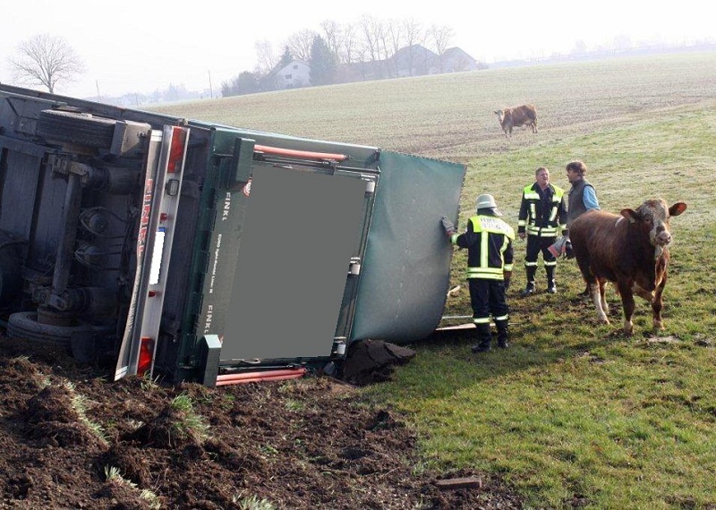 Ein Viehtransporter ist am Mittwochmorgen um kurz nach 8.30 Uhr nahe Asbach mit dem Reifen seines Anhängers auf das Bankett geraten, worauf dieser umstürzte.Die elf Kühe des Transporters blieben unverletzt, nutzten jedoch die Möglichkeit über das beschädigte Dach auf die angrenzende Wiese zu entlaufen.