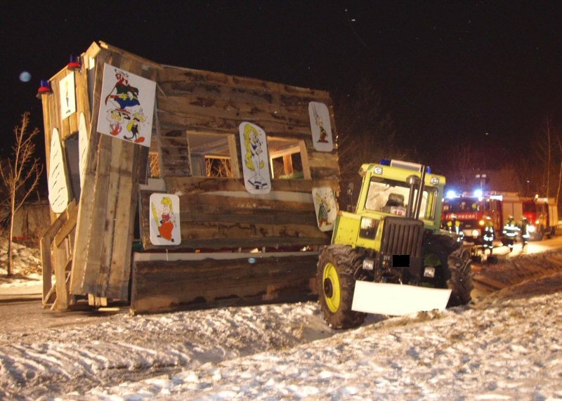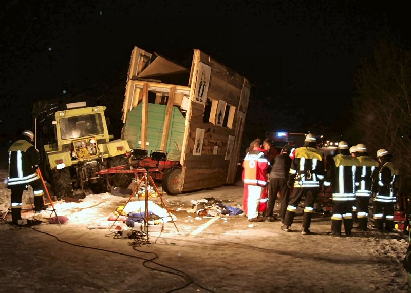 Insgesamt 33 Personen, darunter vier schwer und eine mit lebensgefährlichen Verletzungen wurden bei einem Unfall am Sonntag (26.02.06) kurz vor 18.00 Uhr am Ortseingang von Pasenbach verletzt. Aus noch ungeklärter Ursache kam dort ein Faschingsgespann, bestehend aus Zugmaschine und Anhänger von der Fahrbahn ab; während der Anhänger auf der Strasse stehen blieb, rutschte die Zugmaschine in den Graben – dabei stürzten einige Mitfahrer vom Anhänger.Die sofort neben Polizei und Rettungsdienst alarmierten Feuerwehren aus Pasenbach und Vierkirchen hatten alle Hände voll zu tun und unterstützten die Rettungskräfte bei der Verletztenversorgung, leuchteten die Unfallstelle aus, wobei die Dachauer Feuerwehr zur Unterstützung mit dem Beleuchtungsanhänger angefordert wurde und sorgten für die Verkehrsumleitung. Eine Person musste aufgrund ihrer Verletzungen mit dem Rettungshubschrauber in eine Klinik geflogen werden; zusätzlich wurde der Großraumrettungsbus der Berufsfeuerwehr München zur Unfallstelle entsandt.Glücklicherweise befand sich ein Unternehmen in unmittelbarer Nähe der Unfallstelle, die sofort ihre Räumlichkeiten zur Verfügung stellte, wo dann eine Verletztensammelstelle eingerichtet und von Polizeibeamten die Personalien festgestellt wurden. Hier wurden alle Beteiligten von Rettungsdienst und Feuerwehr, sowie Seelsorgern weiter versorgt und betreut, ehe sie nach Schwere der Verletzungen ins Krankenhaus gebracht, oder von Angehörigen abgeholt wurden.Um sicher zu gehen, dass keine Personen mehr abgängig sind, wurden zusätzlich die Feuerwehren Röhrmoos und Indersdorf alarmiert, die großräumig die Umgebung absuchten. Die Aufräumungs- und Bergungsarbeiten dauerten noch bis in die späten Abendstunden.