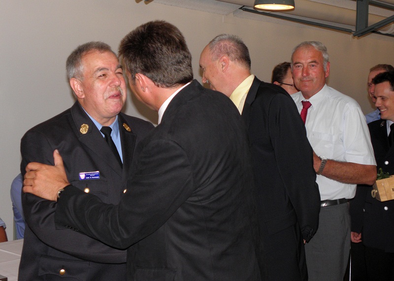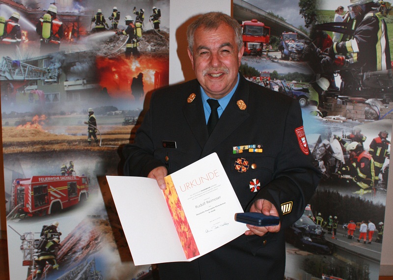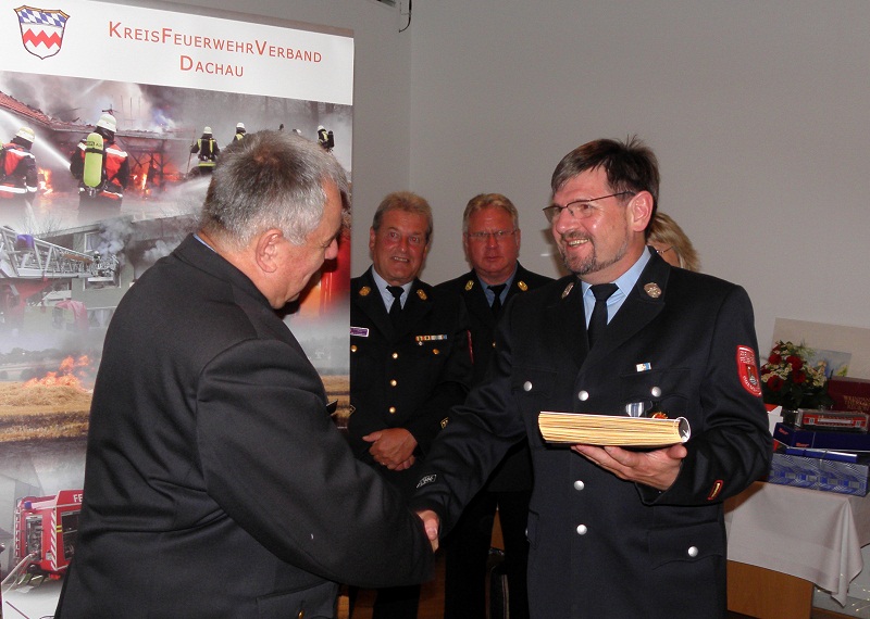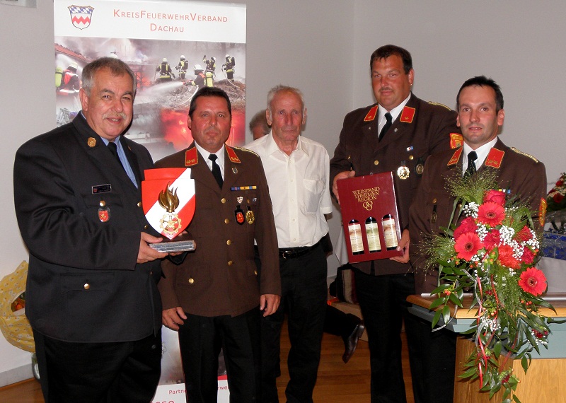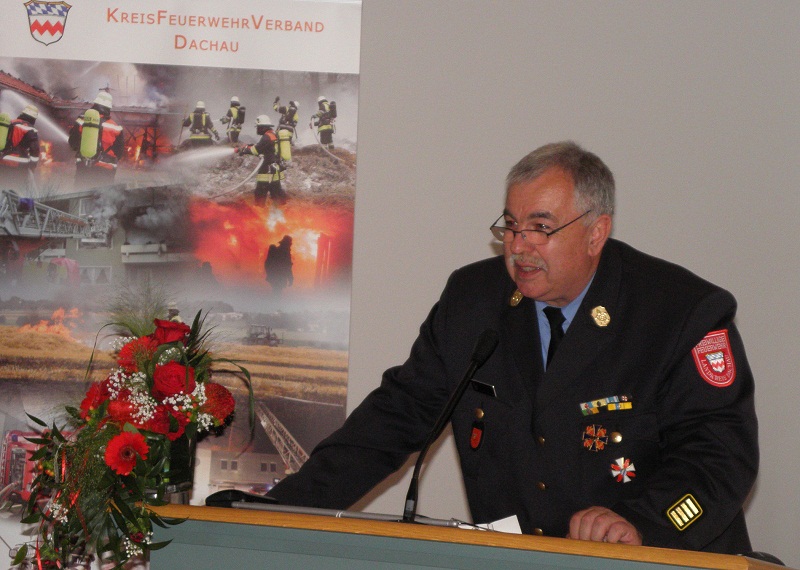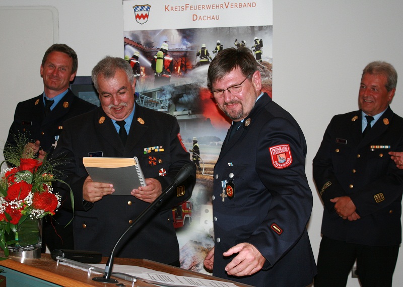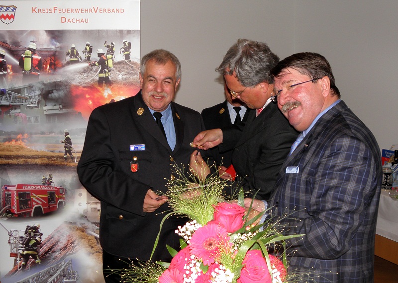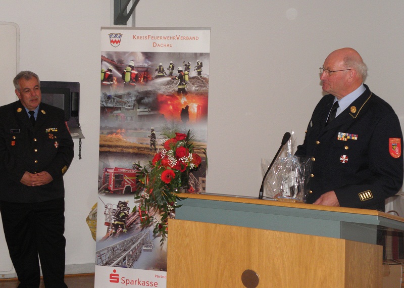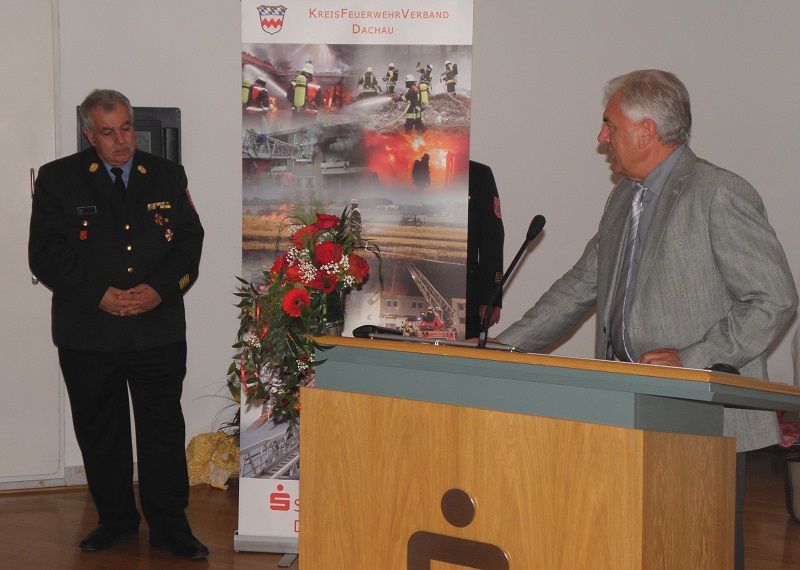 In ihrem Laudatio ließen Landrat Christmann und Regierungspräsident Christoph Hillenbrand Reimosers Werdegang innerhalb der Feuerwehr Revue passieren und ehrten ihn mit dem Feuerwehr-Ehrenkreuz in Gold des Deutschen Feuerwehrverbandes. Weitere Grußworte an diesem Abend sprachen der Vorstandsvorsitzende Thomas Schmid von der Sparkasse Dachau und die Kreisbrandräte Gerhard Bullinger für den Landesfeuerwehrverband Bayern, Karl Neulinger für den Bezirksfeuerwehrverband Oberbayern sowie Markus Reichart für den Arbeitskreis der Kreisbrandräte im ILS-Bereich. Bürgermeister Schneider und Kommandant Thomas Stockreiter überbrachten Grußworte aus dem österreichischen Lindabrunn und für die Kreisbrandinspektion und den Kreisfeuerwehrverband Dachau sprachen Kreisbrandinspektor Heinrich Schmalenberg und Horst Isemann, sowie stellvertretend für die Bürgermeister Dachaus OB Peter Bürgel und Bürgermeister-Obmann Konrad Wagner. Sie alle würdigten die Verdienste und das Engagement Rudi Reimoser während seiner langen Tätigkeit.