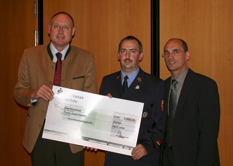 Verena Spitzer von der Stiftung Knochenmarkspende Bayern informierte im Anschluss die Anwesenden über die Typisierung für den an Leukämie erkrankten Feuerwehrkameraden Franz-Josef Hechtl aus Indersdorf. Bei dieser Gelegenheit überreichte der Vertreter der Sparkasse Dachau Arthur Fischer einen Scheck für die Spendenaktion.