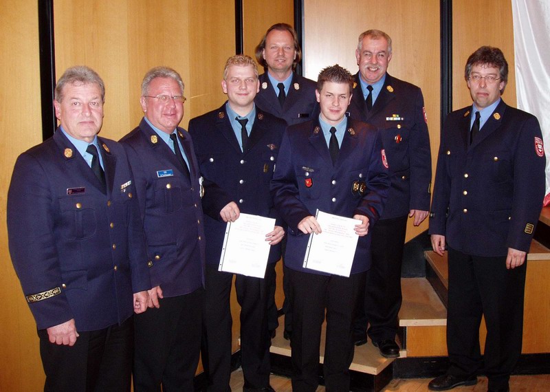 Kreisbrandinspektor Heinrich Schmalenberg und Kreisbrandmeister Jens Franzkowiak dankten den beiden jungen Feuerwehrdienstleistenden für ihr außergewöhnliches Engagement und Verzicht vieler Stunden Freizeit und überreichten beiden ein Präsent. Zu den ersten Gratulanten zählten neben Kreisbrandrat Rudi Reimoser, auch Kreisbrandinspektor Wolfgang Blank und Stadtbrandinspektor Konrad Tonhauser.