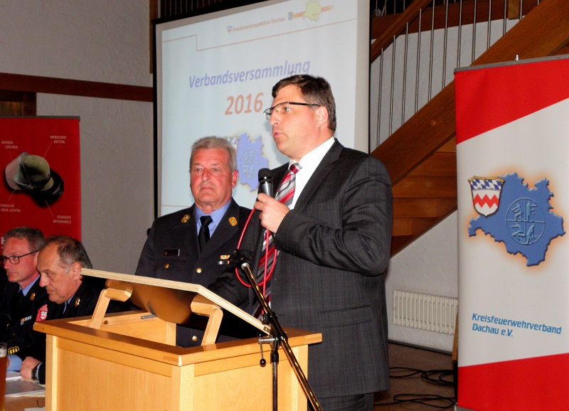 Im Saal der Gaststätte Doll in Ried fand am vergangenen Donnerstag (14.04.2016) die Verbandsversammlung der Kreisbrandinspektion und des Kreisfeuerwehrverbandes Dachau statt; Hauptthema des Abends war die Vorstellung des .Kreisbrandrat Heinrich Schmalenberg konnte dazu neben den Kommandanten und Vereinsvorständen der Landkreisfeuerwehren besonders Landrat Stefan Löwl, den Landtagsabgeordneten Bernhard Seidenath die Bürgermeister der Gemeinden, die Vertreter des Landratsamtes, sowie Mitglieder von THW, BRK und Polizei begrüßen.