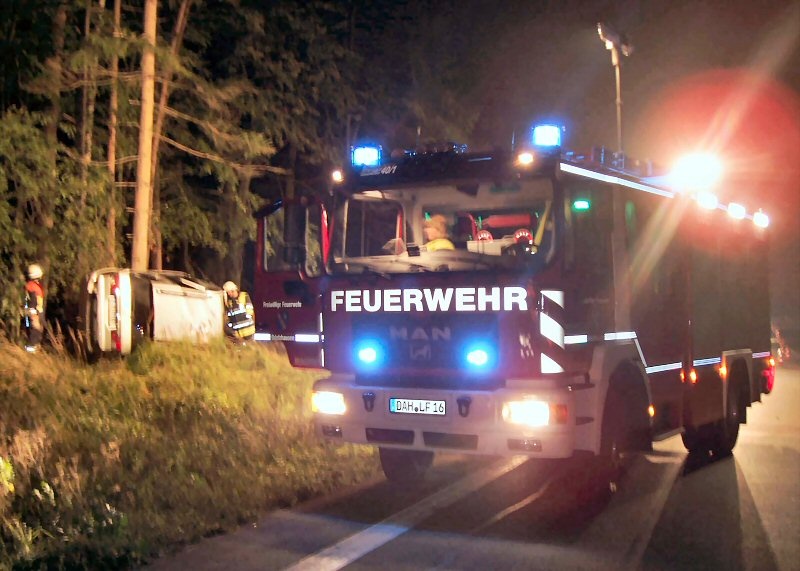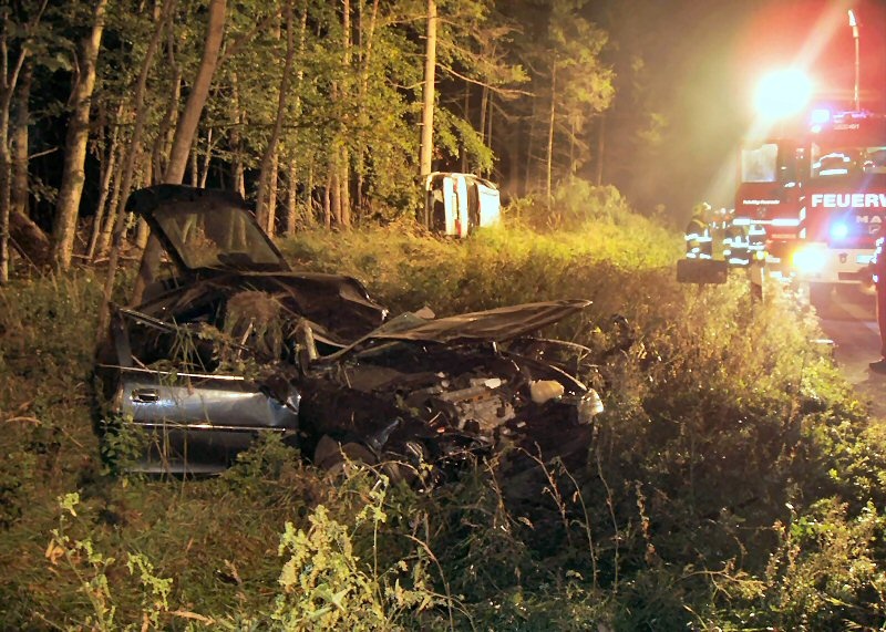 Aus noch ungeklärter Ursache kam es in den frühen Morgenstunden des Samstags (30.09.06) auf der A 8 zwischen den Anschlussstellen Odelzhausen und Adelzhausen zu einem Verkehrsunfall, an dem zwei Fahrzeuge beteiligt waren. Beide Lenker kamen von der Fahrbahn ab und blieben völlig demoliert seitlich liegen, wobei eines der Pkw´s eine Tanne knickte, ehe die Fahrt an einem weiteren Baum endete. Da zunächst der Verdacht bestand, dass die Insassen in den Wracks eingeklemmt seien, wurden die Feuerwehren Odelzhausen, Pfaffenhofen/Gl., Sulzemoos und Wiedenzhausen alarmiert. Beim Eintreffen der Rettungskräfte stellte sich jedoch heraus, dass dies nicht der Fall war; beide Pesonen erlitten leichte, bzw. mittelschwere Verletzungen und wurden von Notarzt und Rettungsdienst erstversorgt, ehe sie ins Krankenhaus eingeliefert wurden. Da zusätzlich die Vermutung nahe lag, dass sich weitere Leute in den Fahrzeugen befanden, wurde in Absprache mit der Polizei von den Feuerwehrkräften das angrenzende Waldstück großräumig durchsucht – unterstützt wurden sie dabei von den Feuerwehren aus dem schwäbischen Adelzhausen und Aichach, wobei die Suche ergebnislos verlief. Zur Klärung des Unfallhergangs wurde ein Gutachter herangezogen, wobei es zeitweise zur Sperrung des Streckenabschnittes kam; die Feuerwehren Feldgeding und Odelzhausen übernahmen mit ihren Verkehrssicherungsanhängern die Umleitung. Die eingesetzten Kräfte vor Ort leuchteten die Einsatzstelle aus und reinigten die Fahrbahn.