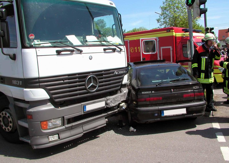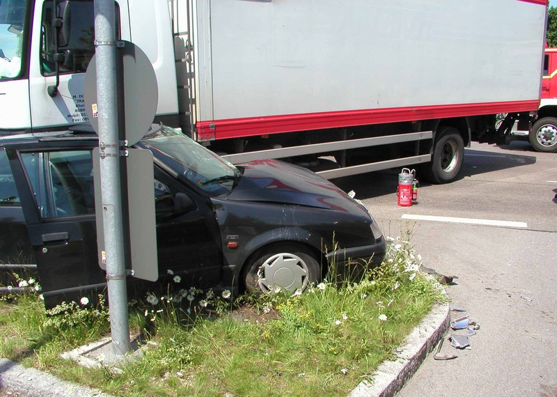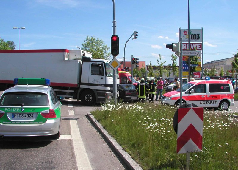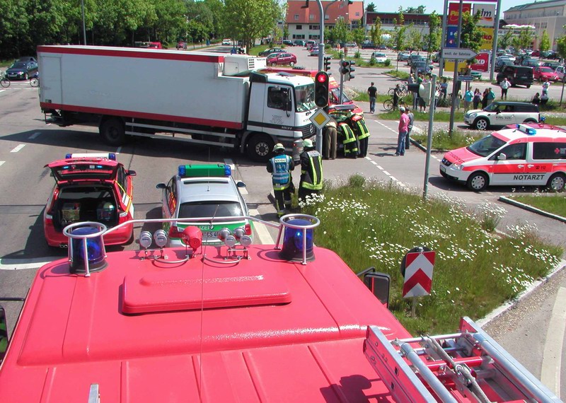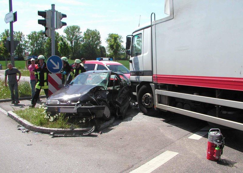 Kurz vor 13.00 Uhr kam es am Mittwoch an der Kreuzung Hoch- / Münchner Straße in Karlsfeld zu einem Verkehrsunfall, der den Einsatz der Feuerwehren Dachau und Karlsfeld erforderte.Aus noch ungeklärter Ursache kam es im Kreuzungsbereich zu einem Zusammenstoß zwischen einem Lkw und Pkw, wobei der Lkw die Fahrerseite des Pkw rammte und das Fahrzeug gegen einen Ampelmast schob.
