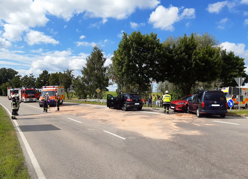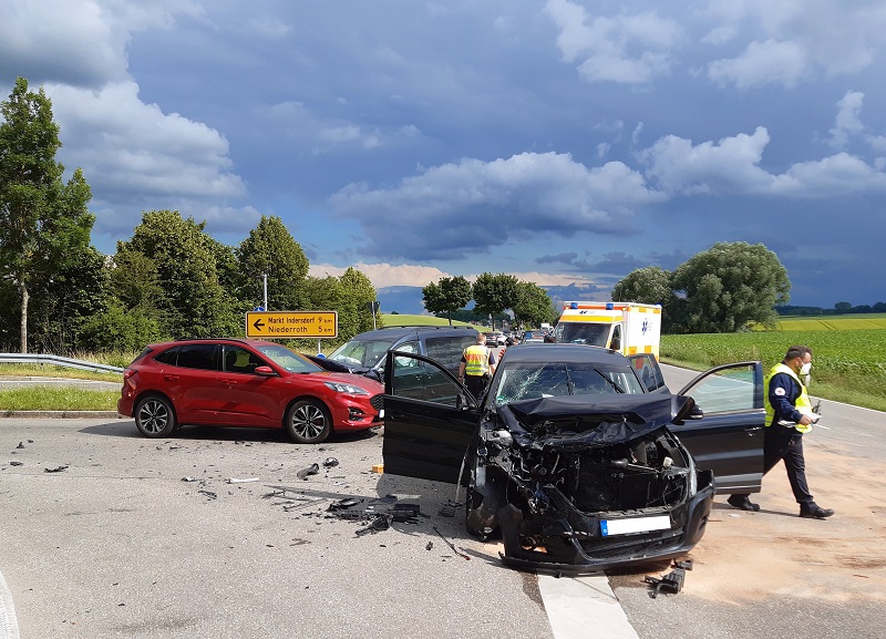 Aus noch ungeklärter Ursache stießen drei Fahrzeuge an der Indersdorfer Gabel zusammen, eingeklemmt wurde glücklicherweise keiner der Beteiligten. Vier Personen wurde bei dem Unfall jedoch verletzt, darunter ein Kind. Dieses musste mit den Rettungshubschrauber zur weiteren Behandlung in eine Klinik transportiert werden.