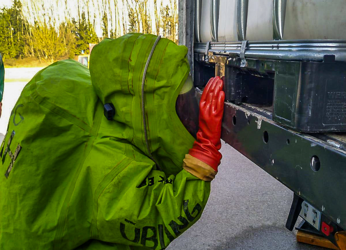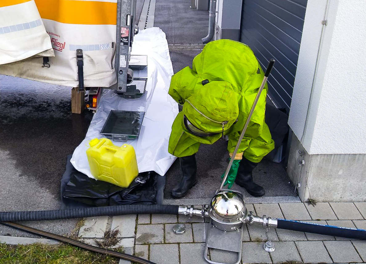 Auf Grundlage der gewonnenen Informationen identifizierten die Einsatzkräfte den Stoff und bestimmten mithilfe eines Nachschlagewerks sowie des zugehörigen Sicherheitsdatenblatts die erforderlichen Einsatzmaßnahmen. Ein besonderer Fokus lag auch auf der Durchführung der Sofort-Dekontamination des ersten Trupps. Da der angenommene Stoff mit Wasser reagierte, wurde auf den Aufbau eines Dekontaminationszeltes verzichtet und stattdessen eine Dekontamination über eine Faltwanne durchgeführt.