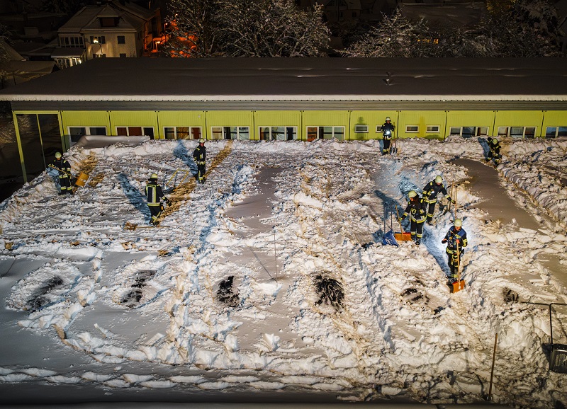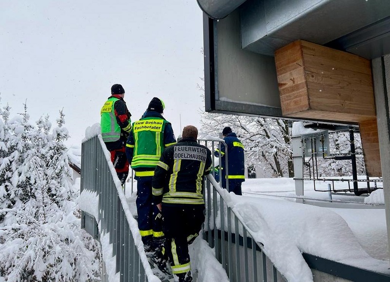 Aber auch bei Gebäuden führten die großen Schneemengen auf den Dächern zu statischen Problemen. Während in Amperpettenbach eine landwirtschaftliche Lagerhalle wegen statischer Bedenken gesperrt werden musste, blieben einige Verbrauchermärkte im Landkreis vorsorglich gleich ganz geschlossen. Bei einem Supermarkt in Odelzhausen befürchtete der Betreiber zunächst das Dach würde den Schneemassen nicht standhalten, ein Fachberater des THW konnte aber nach Prüfung Entwarnung geben. Kurz darauf mussten die Helfer von Feuerwehr und THW gemeinsam das Dach eines Unternehmens der kritischen Infrastruktur im Gewerbegebiet Gada von den Schneemaßen befreien, die Arbeiten dauerten etwa viereinhalb Stunden. Auch in Hebertshausen schaufelte die Feuerwehr rund fünf Stunden lang ein 350 Quadratmeter großes Flachdach im Gewerbegebiet frei.