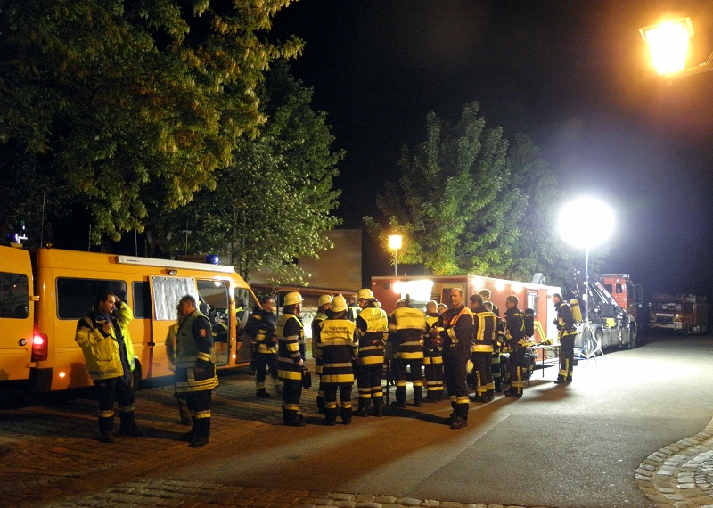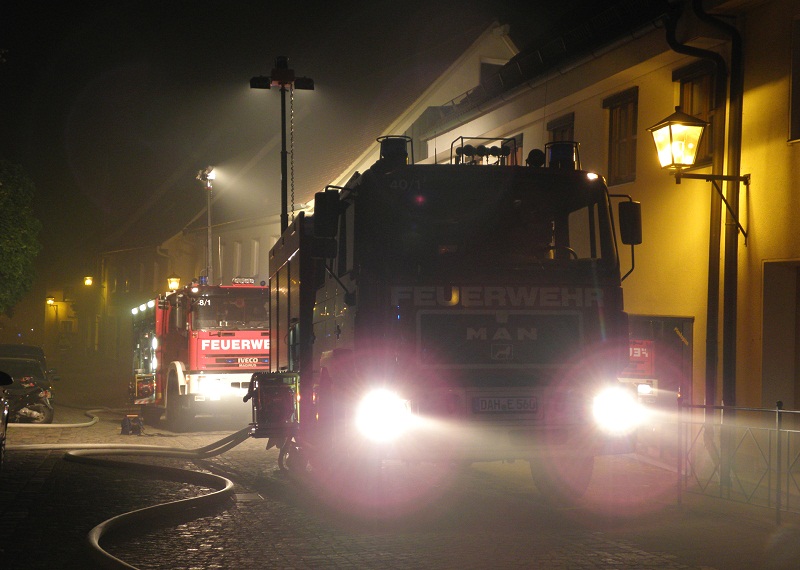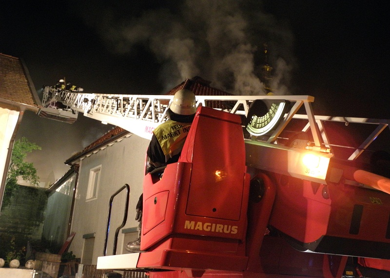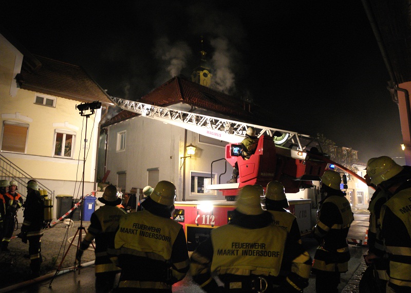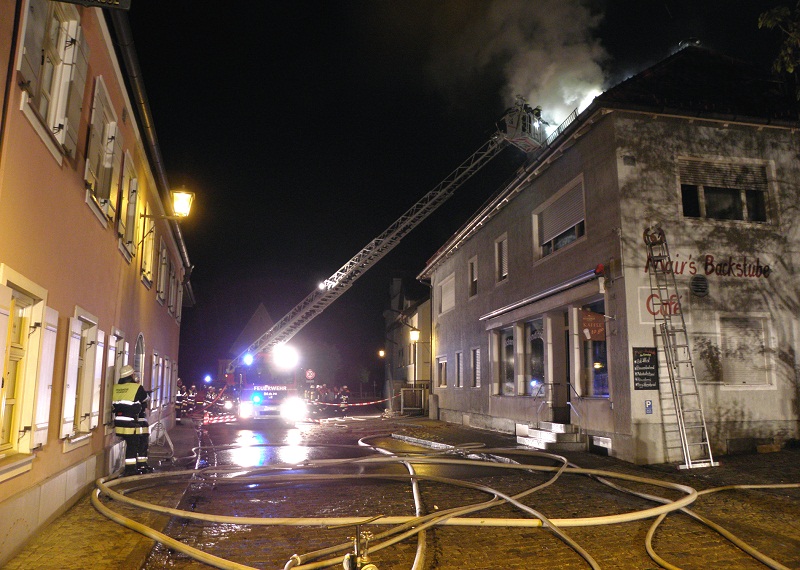 Großalarm für die Feuerwehren im nördlichen Landkreis am Dienstagabend; gegen 21 Uhr informierten Anrufer die Integrierte Leitstelle über eine Rauchentwicklung in einer Bäckerei nahe dem Marktplatz in Altomünster.Beim Eintreffen der ersten Einsatzkräfte stand der Dachstuhl des Wohn- und Geschäftshauses bereits im Vollbrand, die Alarmstufe wurde umgehend erhöht. Eine Person befand sich noch in dem brennenden Gebäude, sie wurde von einem Atemschutztrupp der Feuerwehr Altomünster gerettet.