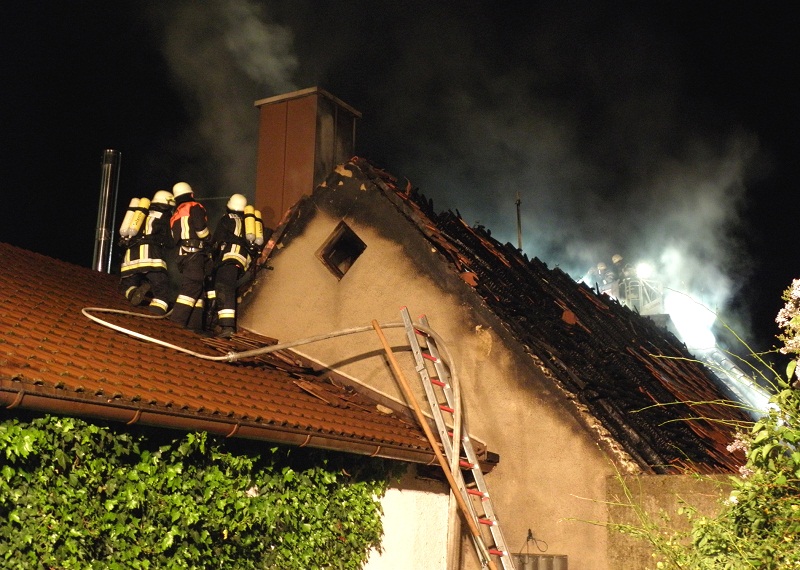 Nach ca. 45 Minuten hatten die eingesetzten Wehren das Feuer unter Kontrolle. Mit den Nachlöscharbeiten hatten jedoch mehrere Trupps unter schwerem Atemschutz noch gut zwei Stunden zu kämpfen. Wertvolle Hilfe leistete dabei die Drehleiter der Feuerwehr Indersdorf, mit der die Dachhaut zur Ortung versteckter Glutnester geöffnet wurde.