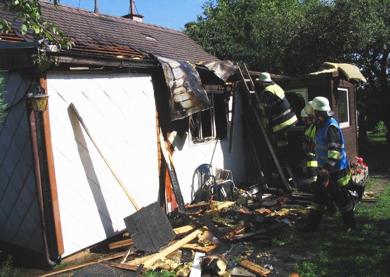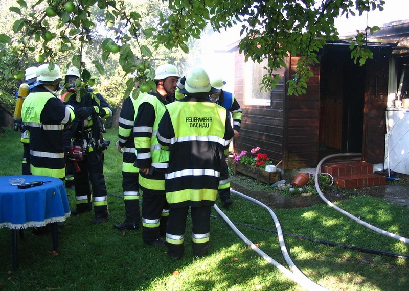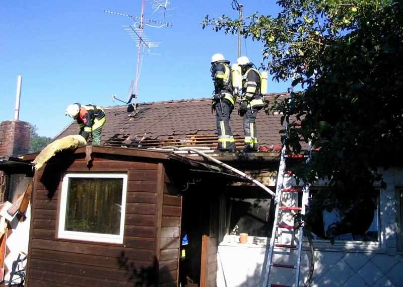 Durch starke Rauchentwicklung wurden Nachbarn am Mittwochmorgen (06.08.2008) auf einen Wohnhausbrand in der Torstr. in Hebertshausen aufmerksam und informierten sofort Feuerwehr, Polizei und Rettungsdienst.Die alarmierten Kräfte der Feuerwehren Ampermoching, Dachau und Hebertshausen drangen unter schwerem Atemschutz in die Räumlichkeiten vor und setzten zur Brandbekämpfung mehrere C-Rohre ein. Da der Dachstuhl des Gebäudes durchzündete und das Haus in Vollbrand geriet, wurde die Feuerwehr Karlsfeld mit einem Löschzug zur Unterstützung nachalarmiert.