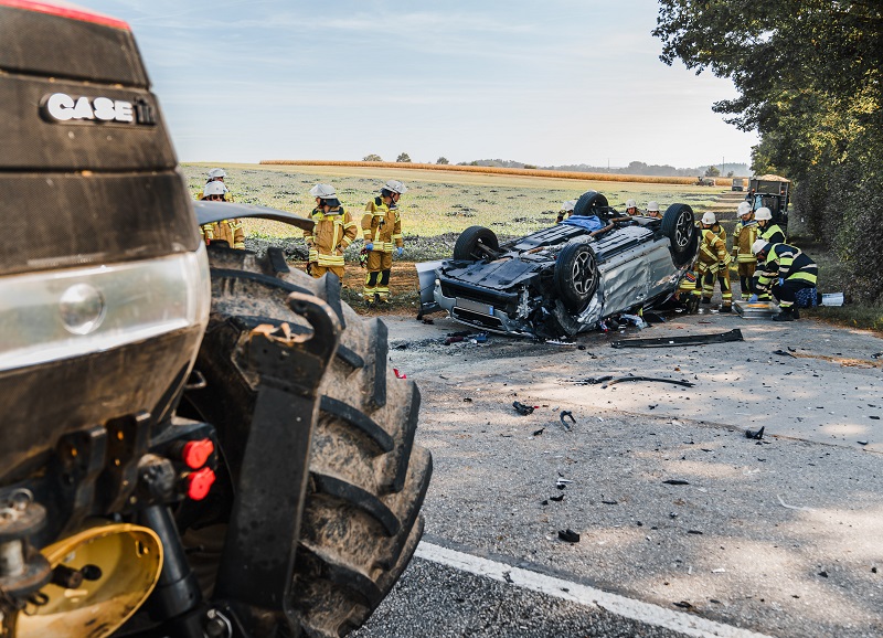 Nach vorläufigen Erkenntnissen scheint der PKW versucht haben den Traktor zu überholen, ohne zu bemerken, dass dieser nach links abbiegen wollte. Der Subaru kollidierte dabei mit dem Traktor und blieb auf dem Dach liegen, wodurch die Insassen des Fahrzeugs nicht in der Lage waren, sich selbst zu befreien.