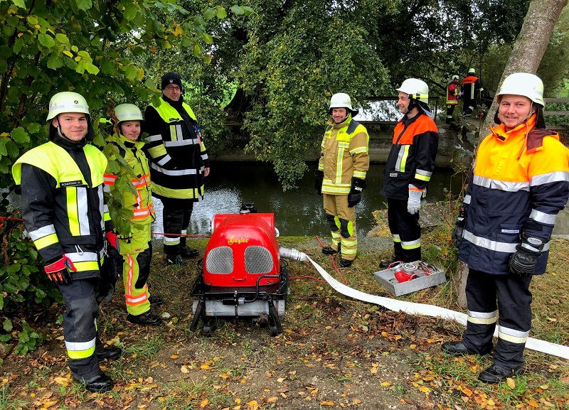 Zum Abschluss wurde an der Glonn in Markt Indersdorf die Wasserentnahme aus offenen Gewässern sowie die anschließende Wasserförderung über eine 1.000 Meter lange Schlauchstrecke geübt.